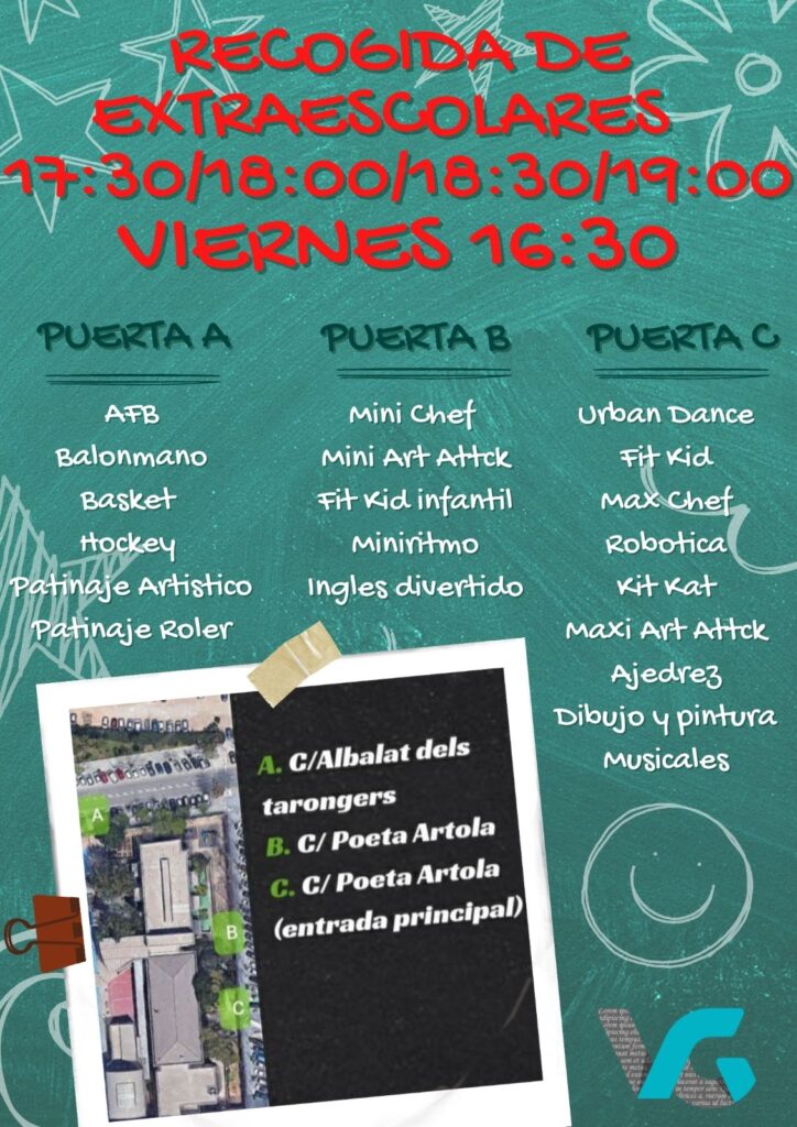 SALIDAS EXTRAESCOLARES En la infografía está resumido por dónde salen los alumnos de cada actividad. Recordad llevar el carnet de recogida.