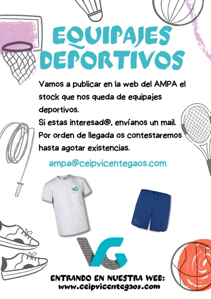 Ultimas unidades equipaje deportivo En el listado adjunto puedes consultar el stock y precio del equipaje deportivo disponible. Si estás interesado no dudes en hacer tú pedido en el correo ampa@ceipvicentegaos.com