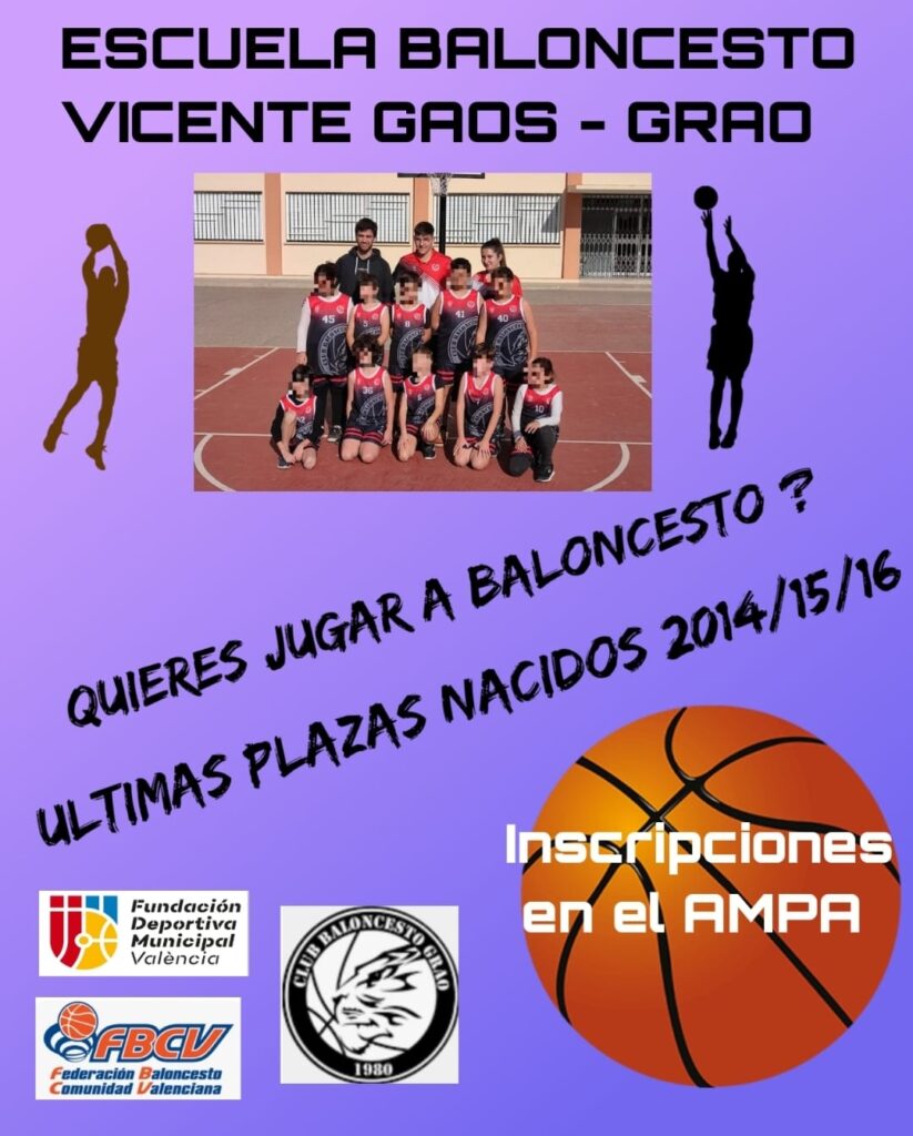 Bàsket Vicente Gaos-Grao Encara hi ha places disponibles per a unir-te a l’escola de Bàsquet. Per als nascuts en 2015, 2015 i 2016.