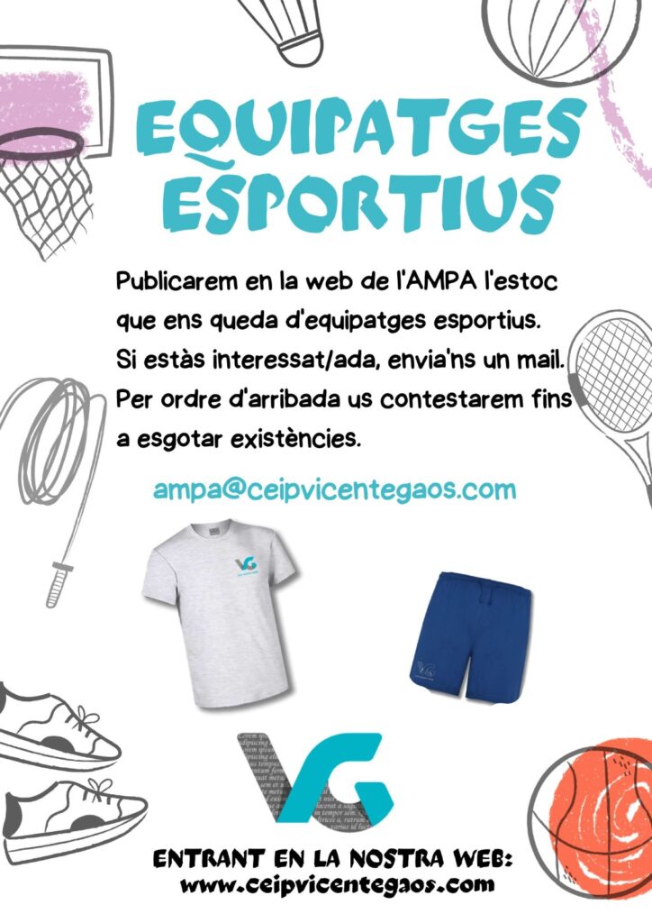 Ultimes unitats equipatge deportiu En el llistat adjunt pots consultar les unitats i preu de l’equipaje disponible. Si estas interesat no dubtes en escriure al correu ampa@ceipvicentegaos.com